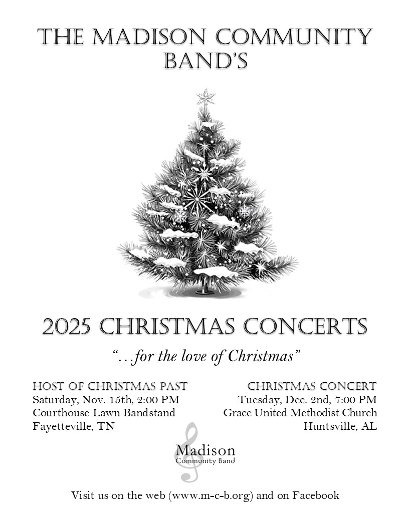 The Madison Community Band performs annually for various events throughout the Tennessee Valley, including Huntsville’s Panoply of the Arts, Madison’s Gazebo Concerts, Decatur’s Concerts by the River, and the Host of Christmas Past Festival in Fayetteville , TN. We have also been honored to perform at the US Space and Rocket Center, the Lakeside Summer Concert Series in Guntersville and at Guntersville State Park.