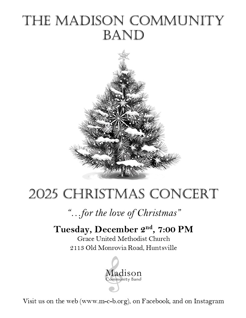 Next Performance: Tuesday, December 2, 2025 MCB Christmas Concert Grace United Methodist Church 2113 Old Monrovia Road Huntsville, AL 35806 Call time – 6:30PM Performance time – 7:00PM |